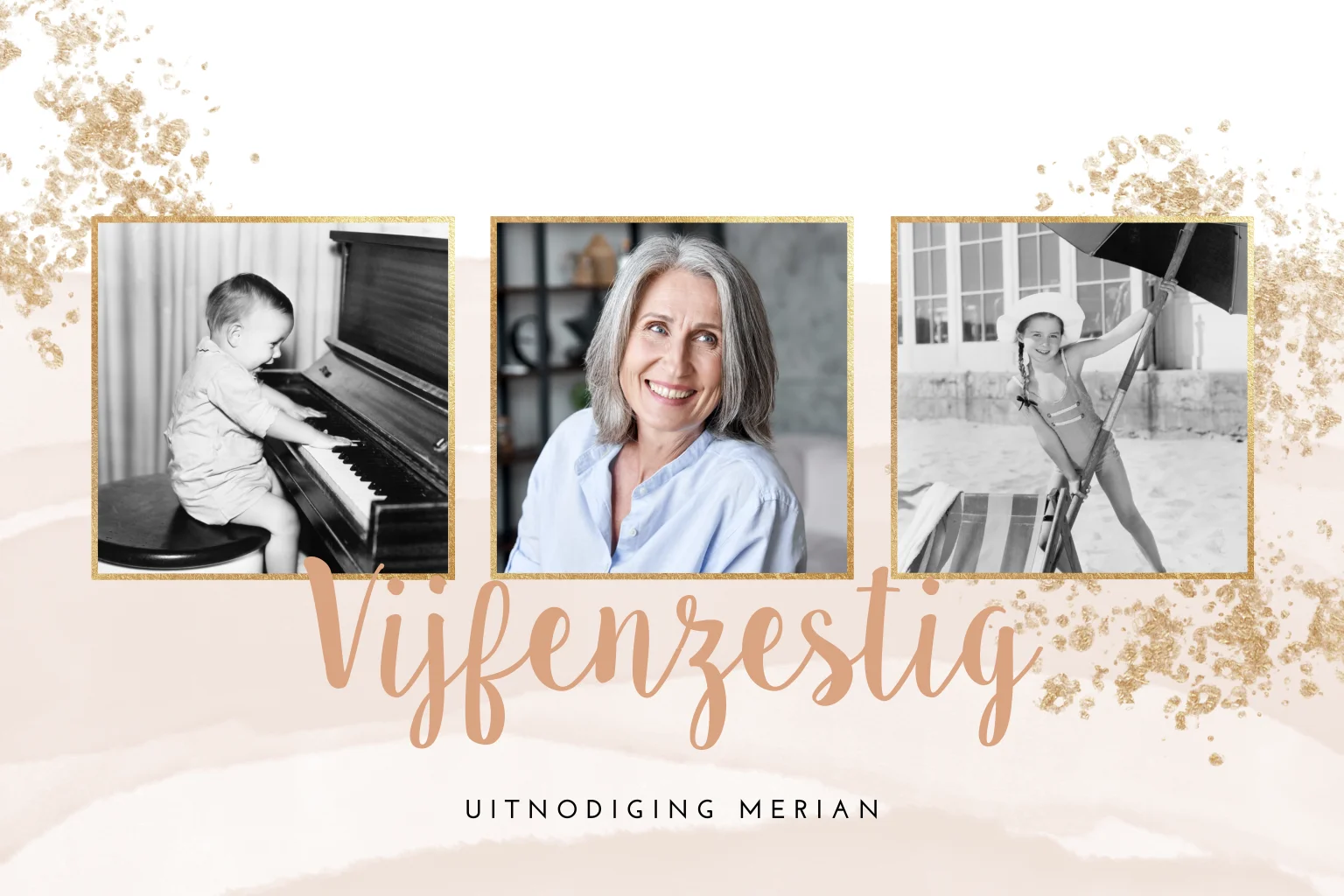 Een stijlvolle verjaardagsuitnodiging met foto's en goudlook spetters. Wil je de uitnodiging een extra feestelijke uitstraling geven? Pas de tekst in onze editor dan eenvoudig aan naar roséfolie.
