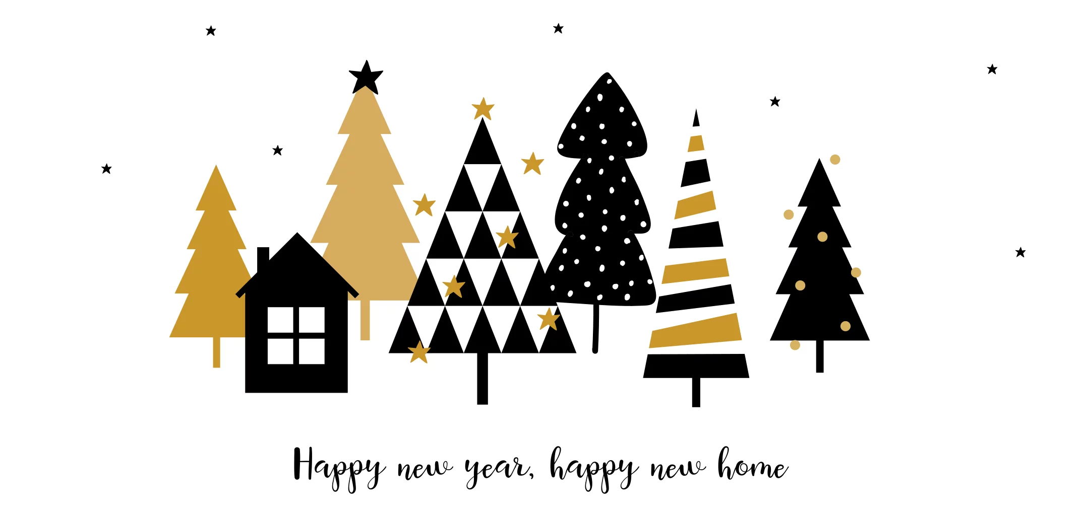 Origineel en hip verhuiskaartje met kerstbomen en sterretjes in zwart wit met gouden details. Maak de kerst sfeer compleet met parelmoer papier en envelop.