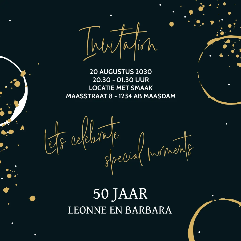 Originele verjaardagsuitnodiging voor een 50e verjaardag met spetters in goud. Extra feestelijk op parelmoer papier met gouden envelop.