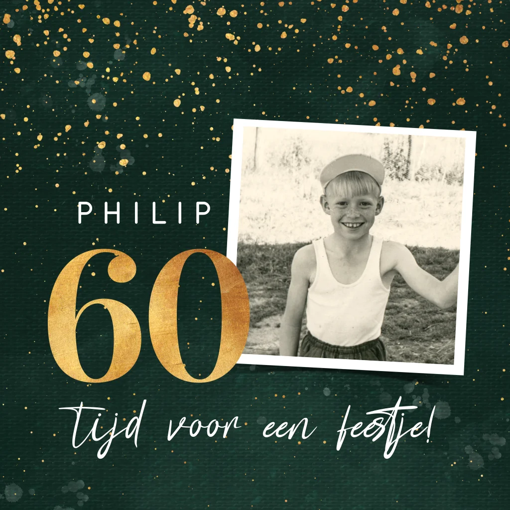 Een vrolijke uitnodiging verjaardag met gouden confetti. Het cijfer zestig springt er mooi uit in deze goudlook. Een persoonlijke verjaardagsuitnodiging met foto van de jarige.