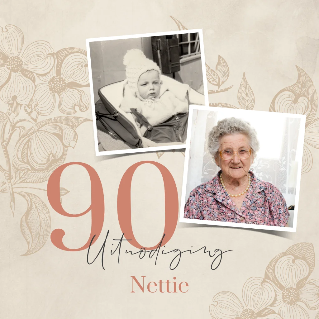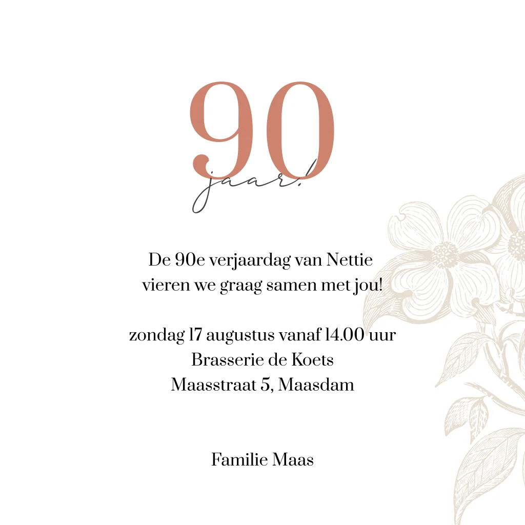 Stijlvolle verjaardagsuitnodiging voor een 90e verjaardag met mooie geïllustreerde bloemen. Voeg eenvoudig je foto's toe op de voorzijde en maak zo je persoonlijke uitnodiging.