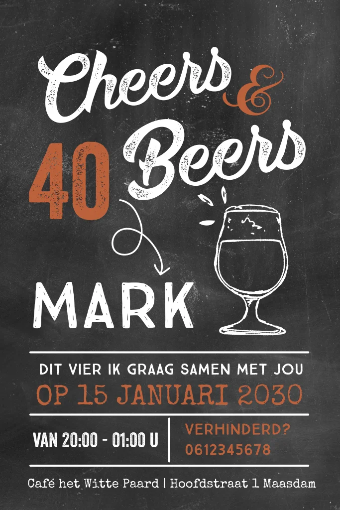 Stoere uitnodiging voor de veertigste verjaardag van een man met krijtbord achtergrond en retro typografie.