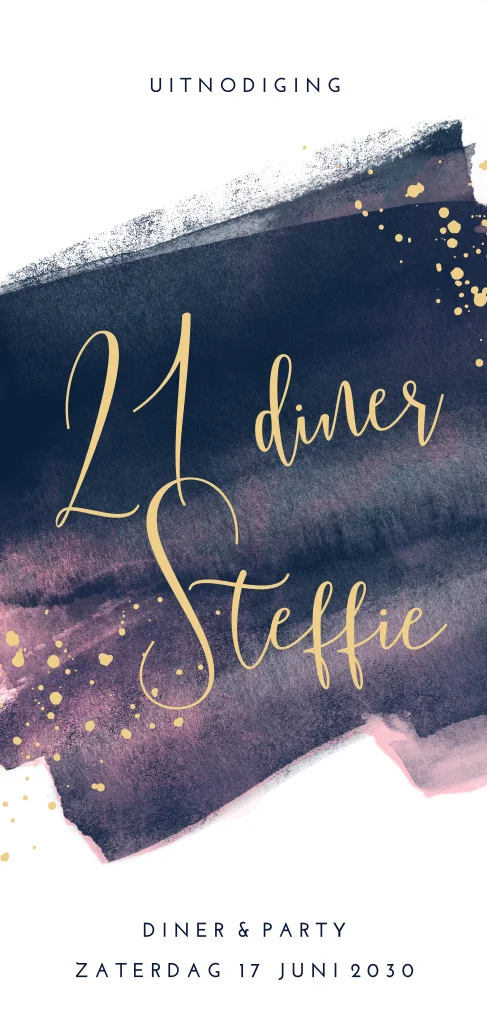 Uitnodigingskaart twenty one dinner met water color en spetters in goud. Extra feestelijk op parelmoer papier met bijpassende envelop.