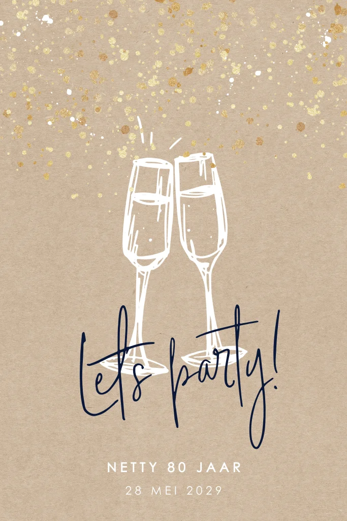 Verjaardag uitnodiging 80 jaar met champagne en gouden confetti