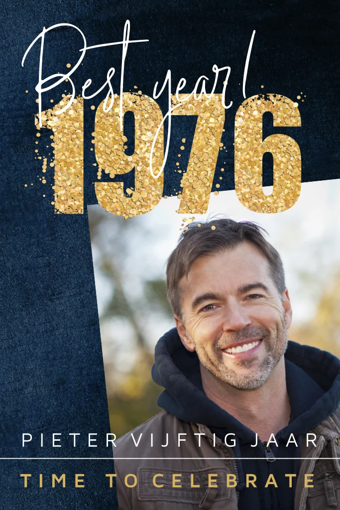 Gave feestelijke uitnodigingskaart voor een vijftigste verjaardagsfeest met gouden confetti en donkerblauwe achtergrond.