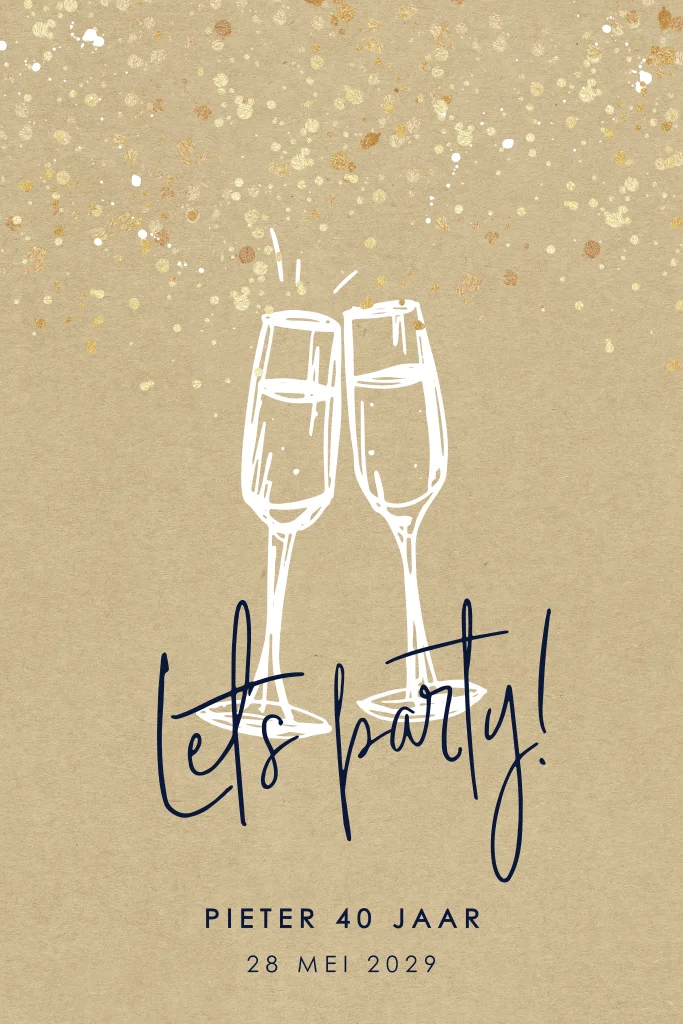 Vrolijke uitnodiging met proostende champagne glazen voor een 40e verjaardag met spetters in goud kleur op kraft look achtergrond.