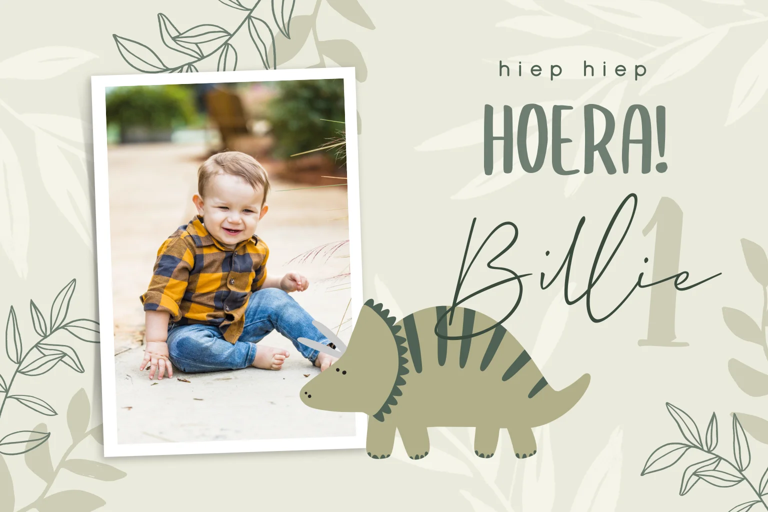 Vrolijke uitnodiging kinderfeestje met een stoere dino. Voeg eenvoudig je eigen foto toe op de voorzijde en maak zo je persoonlijke verjaardagsuitnodiging.