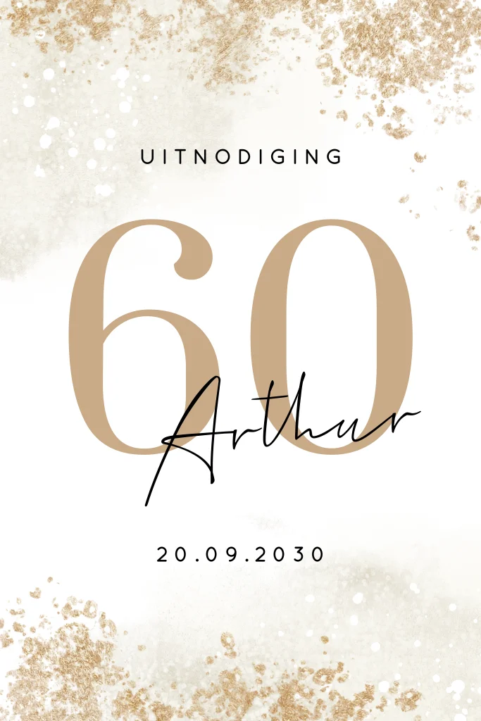 Feestelijke verjaardagsuitnodiging zestig jaar. De kleur van de watercolor kan eenvoudig aangepast worden in onze editor. Maak zo je persoonlijke verjaardagsuitnodiging.