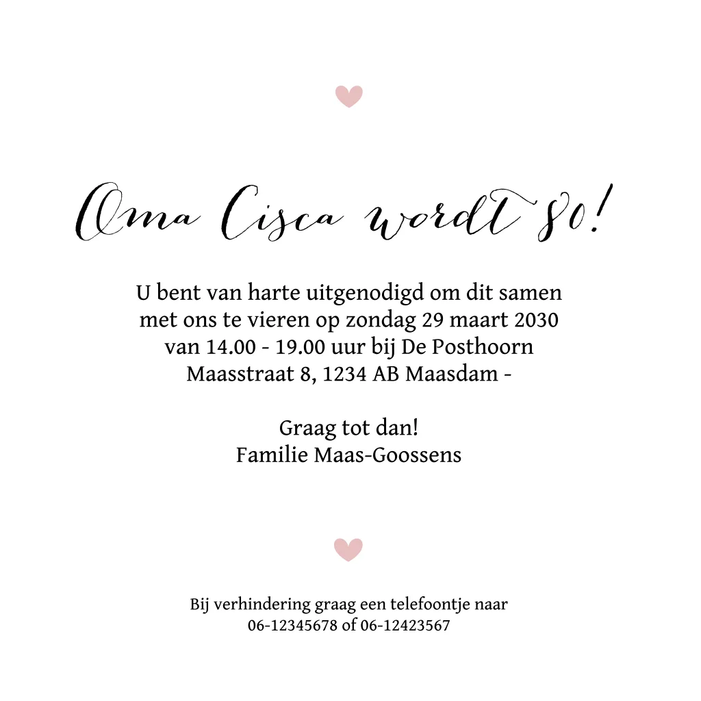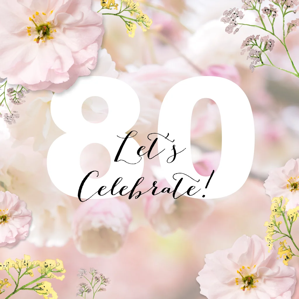Uitnodigingskaarten maken 80 jaar met bloemen en stijlvolle typografie. Prachtig op parelmoer papier met bijpassende envelop.