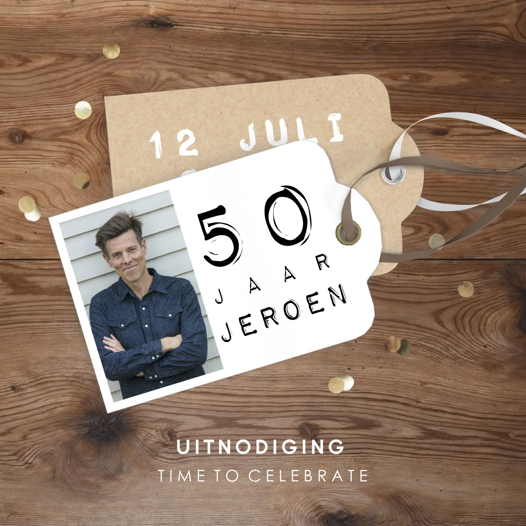 Stoere uitnodiging verjaardag met foto en houtlook achtergrond