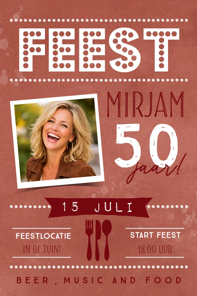 Vier je vijftigste verjaardag met deze vrolijke uitnodiging met foto en feestletters.