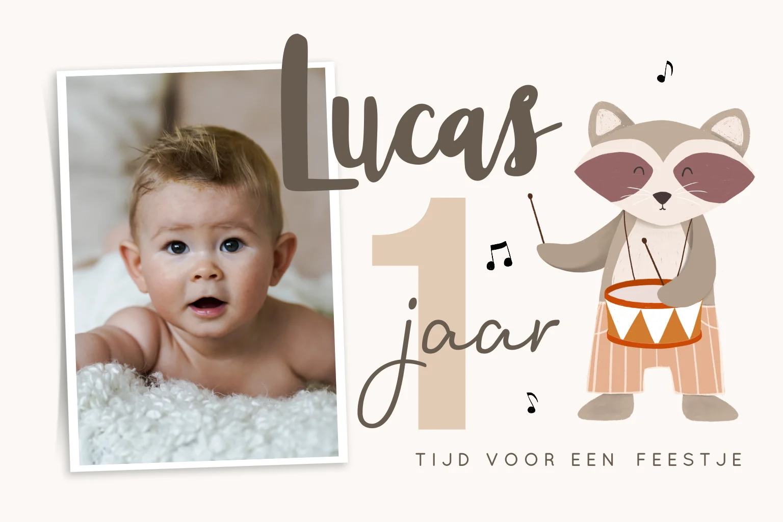 Nodig familie en vrienden uit voor de eerste verjaardag van je kleine met deze vrolijke uitnodiging met een feestelijke wasbeer met trommel. De foto op de voorzijde maakt deze kaart heel persoonlijk!