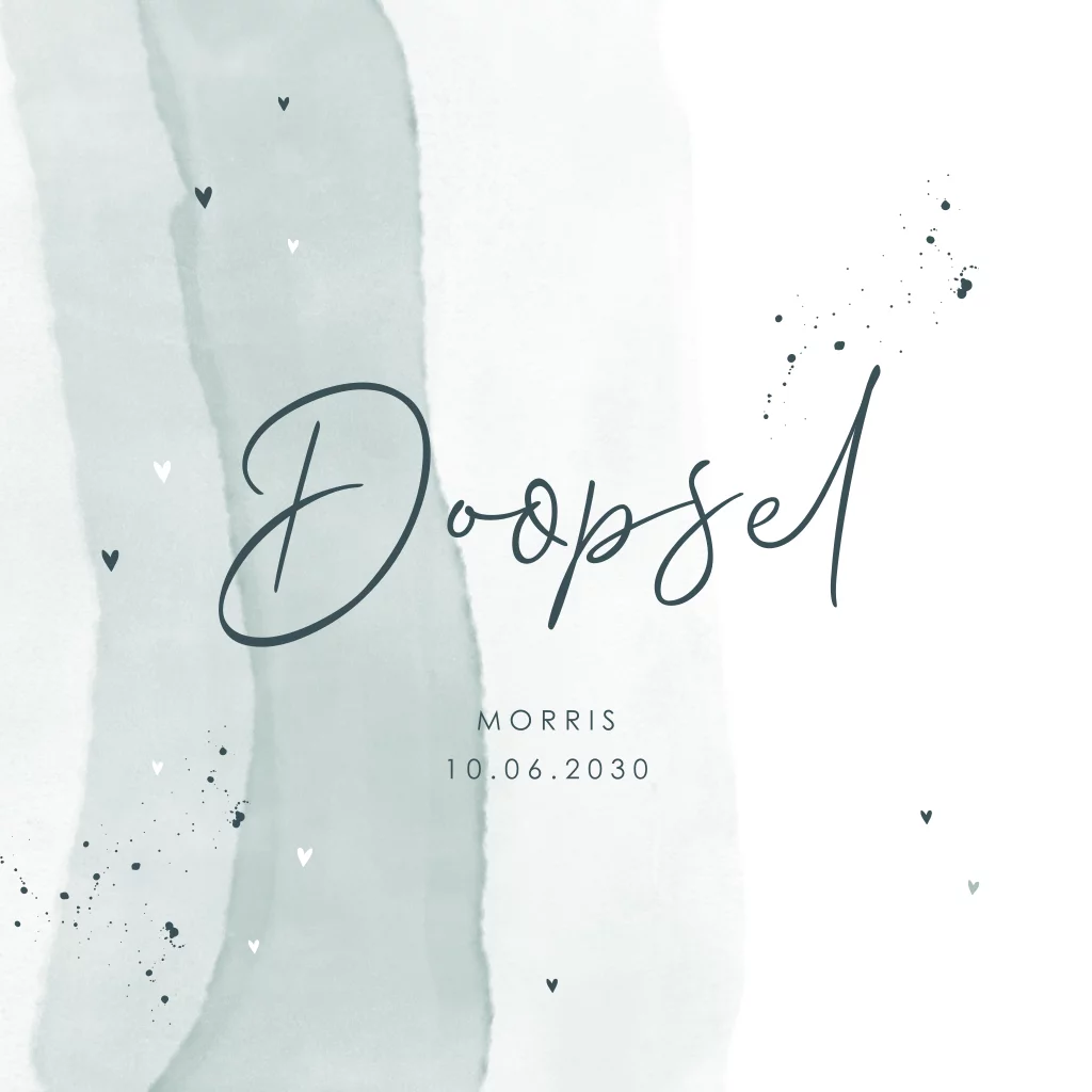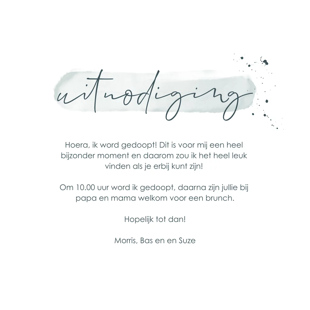 Stijlvolle uitnodiging doopsel met watercolor strepen en spetters. Liever andere kleuren? Dit kun je heel gemakkelijk zelf aanpassen in onze editor!