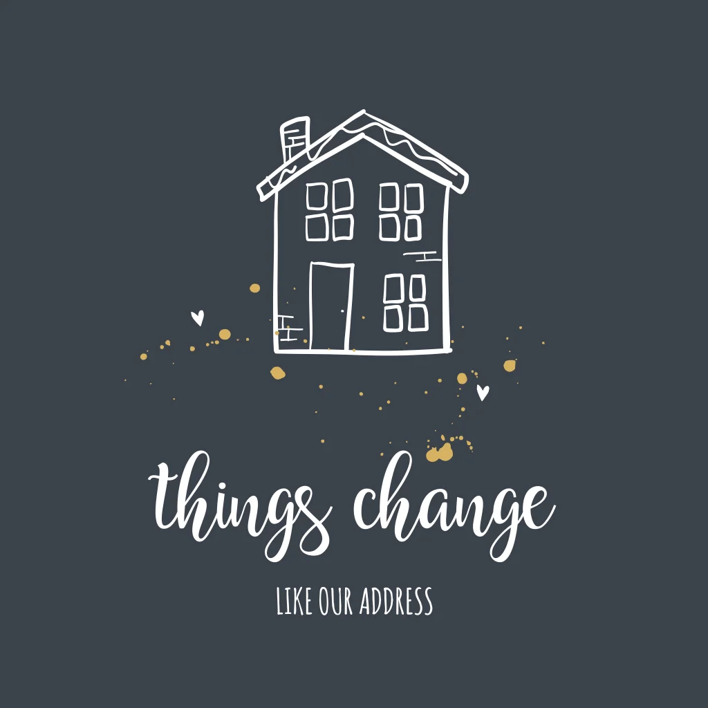 Een vrolijk verhuiskaartje met een illustratie van een huisje, omringt door spetters in goud kleur en hartjes.