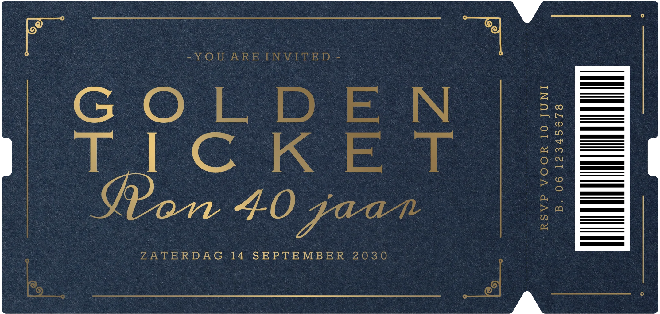 Stijlvolle verjaardagsuitnodiging voor een 40e verjaardag in ticket vorm. De mat goudfolie details geven de kaart een extra feestelijke uitstraling. Kies heel eenvoudig illustraties, foto's en afbeeldingen uit onze beeldbank. Voeg eigen foto's en tekst toe en maak een unieke kaart. Lees hier onze tips voor het ontwerpen van het kaartje.