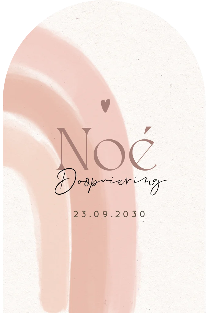 Een lieve doopkaart met een watercolour regenboog in roze pastelkleuren. De kaart zelf heeft een originele boogvorm. Pas het kaartje naar wens aan in onze online editor.