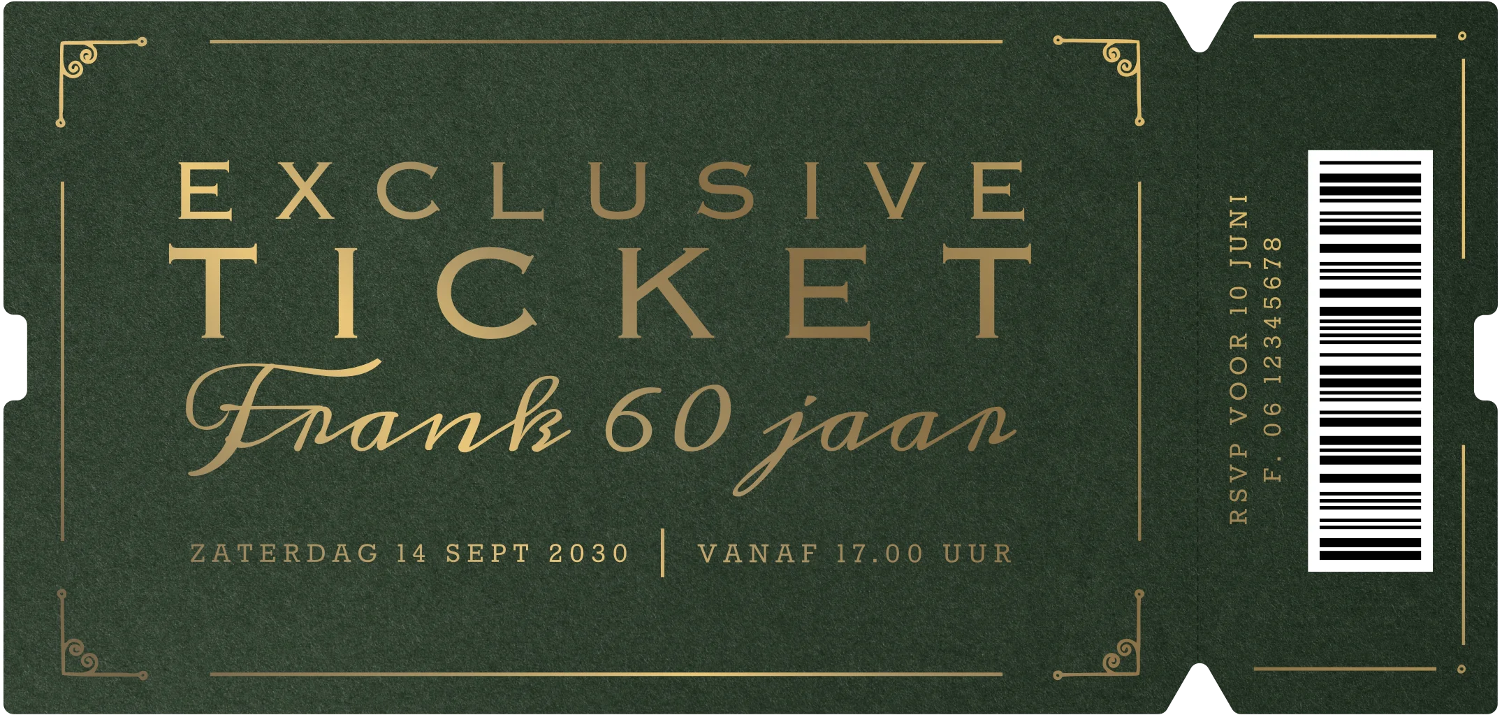 Stijlvolle ticket verjaardagsuitnodiging 60 in groen met mat goudfolie