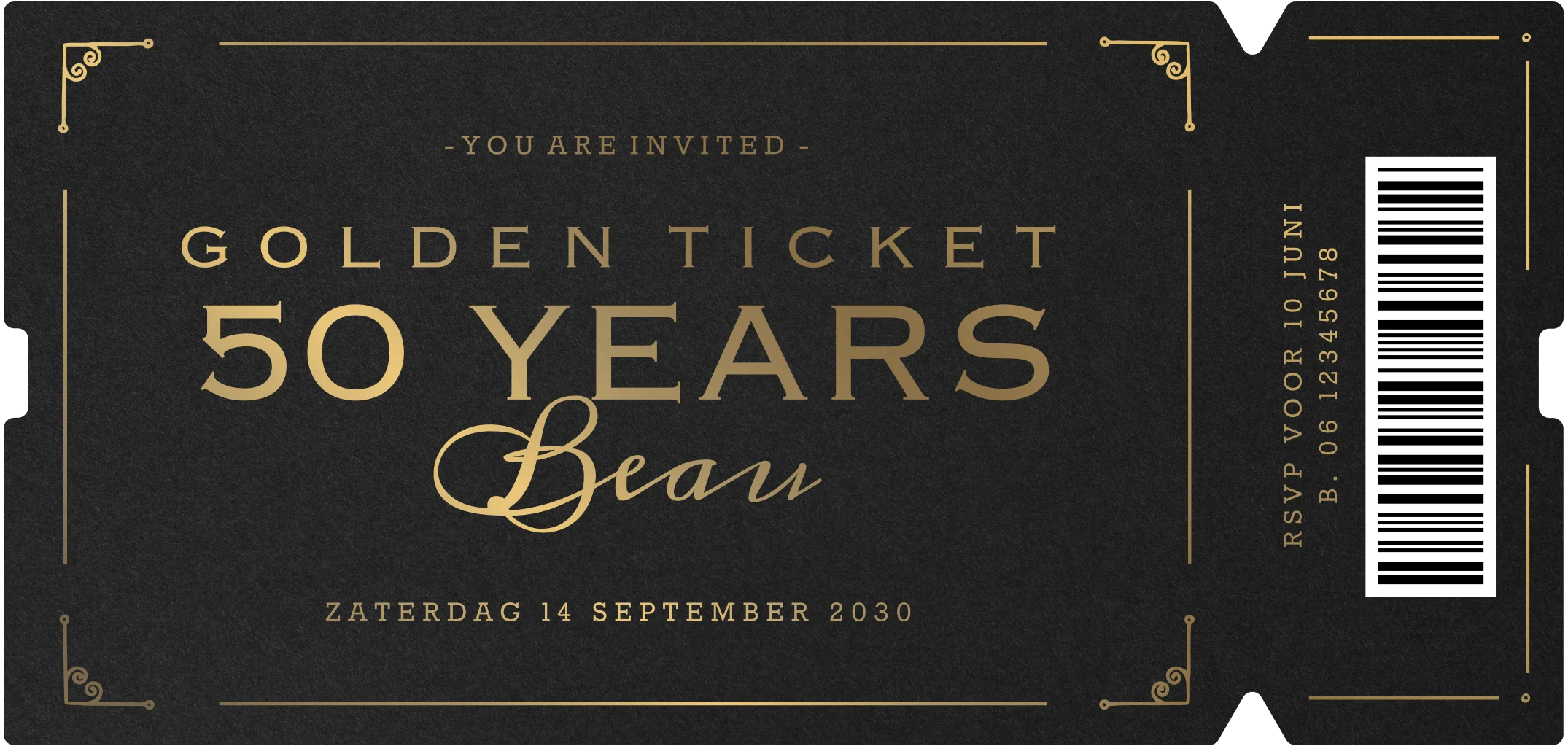 Stijlvolle verjaardagsuitnodiging voor een 50e verjaardag in ticket vorm. De mat goudfolie details geven de kaart een extra feestelijke uitstraling. Kies heel eenvoudig illustraties, foto's en afbeeldingen uit onze beeldbank. Voeg eigen foto's en tekst toe en maak een unieke kaart. Lees hier onze tips voor het ontwerpen van het kaartje.