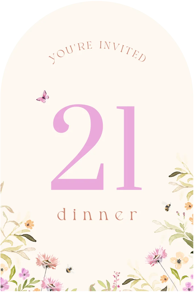Nodig je vriendinnen uit voor je 21 diner met deze super mooie uitnodiging met veldbloemen en vlinders! Je past gemakkelijk kleuren, lettertypes en andere elementen aan met de online editor.