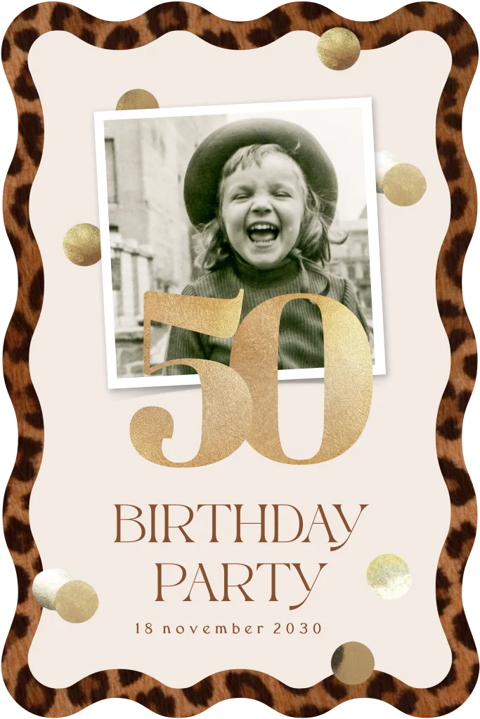 Nodig je vrienden en vriendinnen uit voor je vijftigste verjaardag met deze toffe panter print kaart met golvende randen! Pas gemakkelijk lettertypes, kleuren en andere elementen aan met de online editor.
