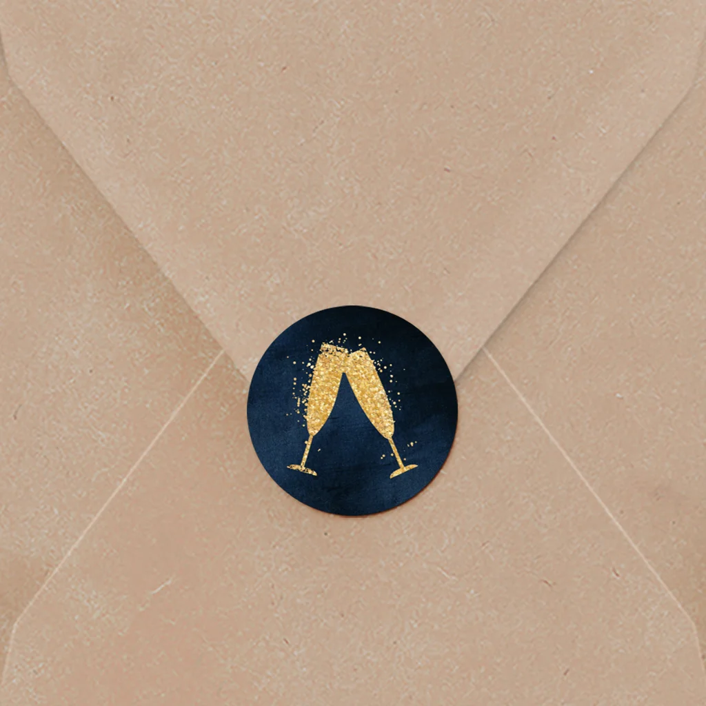 Sluitsticker met champagne glazen en gouden glitters | 25 stuks