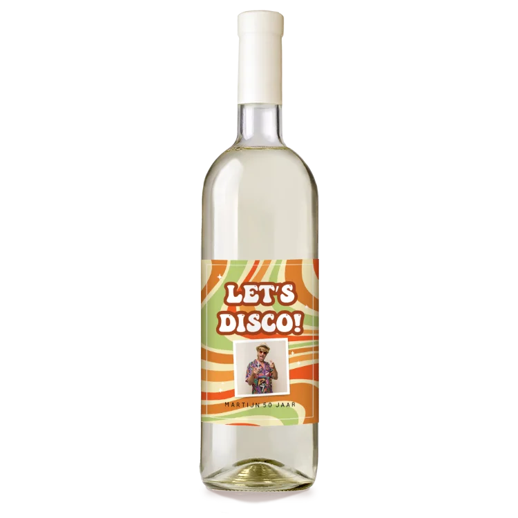 Een wijnetiket in stijl van je seventies feestje! Je eigen foto maakt het wijnetiket compleet. Pas het etiket gemakkelijk aan naar jullie smaak in de editor. Voeg eventueel tekst en andere elementen - ook in goudfolie - toe.