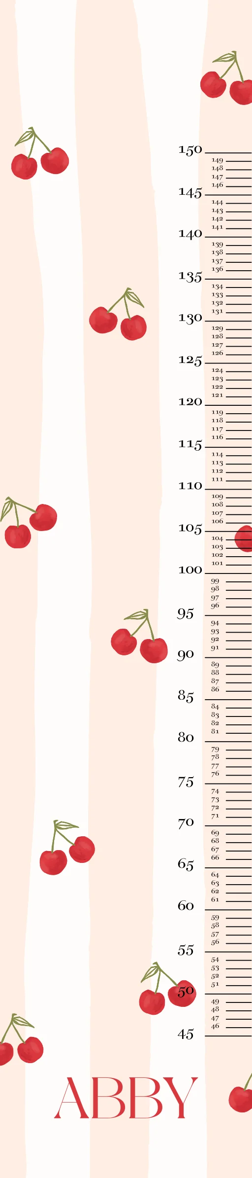 Wat een hippe groeimeter voor de kinderkamer. De groeimeter heeft pastel oranje strepen met daarop kersjes.