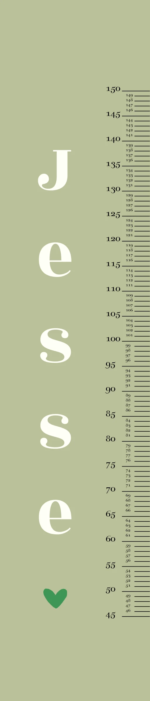 Wat een leuke groeimeter voor de kinderkamer. Deze groeimeter heeft een groene achtergrond met onder de naam een hartje. Pas de groeimeter naar wens aan in de online editor.