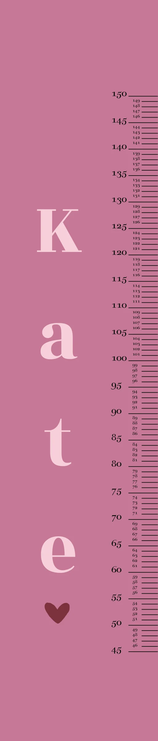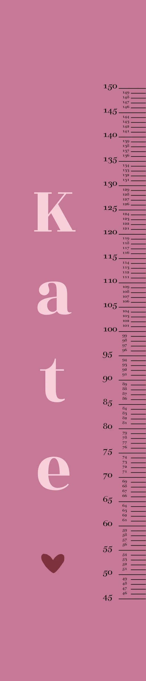 Iedere kinderkamer wordt leuker met deze groeimeter! Deze groeimeter heeft een roze achtergrond met onder de naam een hartje. Pas de groeimeter naar wens aan in de online editor.