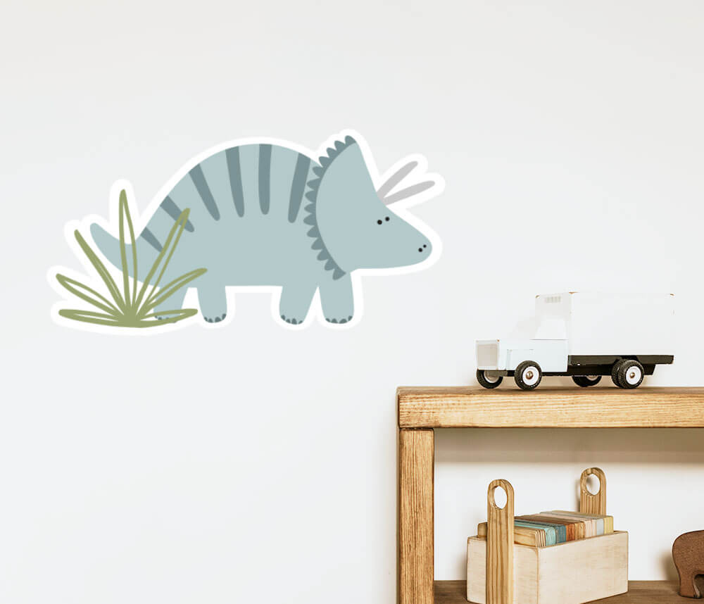 Stoer en vrolijk tegelijk, deze muursticker voor de babykamer! De grappige dino is in twee kleuren blauw met grijs en heeft een witte rand.