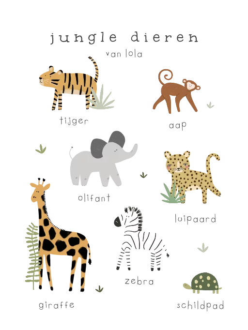 Op deze canvasposter staan zeven grappig getekende jungledieren in natuurlijke kleuren. Superleuk voor de babykamer! Kies voor dit ontwerp en bewerk gemakkelijk alle elementen.