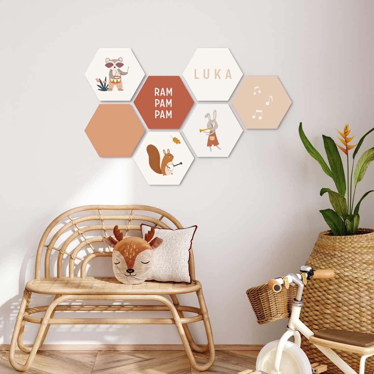 Wat een leuk design voor de babykamer, dit bord van dibond in de vorm van een hexagon! Vos, eekhoorn en konijn maken er een vrolijke boel van en spelen samen muziek.