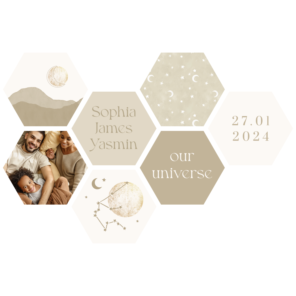 Wat een leuk hexagon wandbord voor de babykamer, om dromerig van te worden! Op de kleurvlakken in natuurlijke tinten is plaats voor eigen tekst.