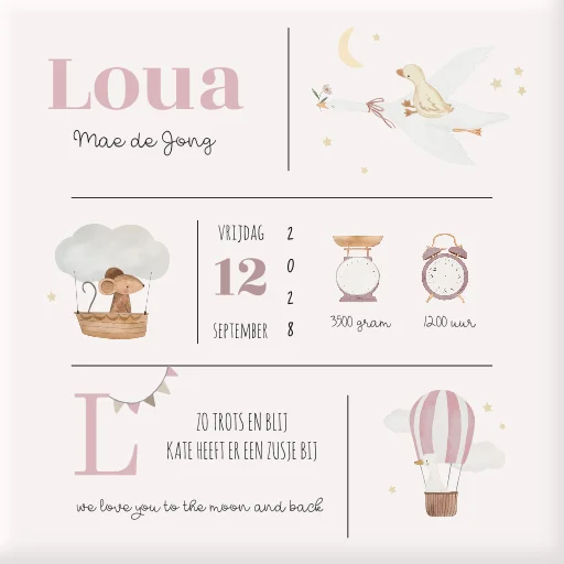 Wauw, wat een lief geboortetegeltje! Dit tegeltje is het perfecte kraamcadeautje. De tekst en elementen pas je gemakkelijk zelf aan in de online editor.