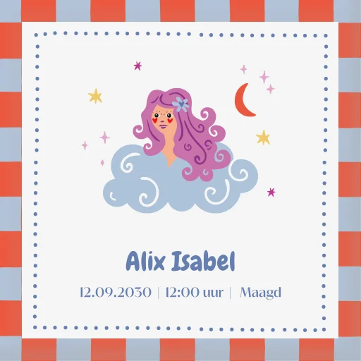 Hoe gaaf! Dit tegeltje is perfect als kraamcadeautje of om de babykamer mee te versieren. Deze geboortetegel heeft een kleurrijk ontwerp met sterretjes en een maan en het sterrenbeeld maagd. Bewerk het ontwerp helemaal naar wens in de editor.