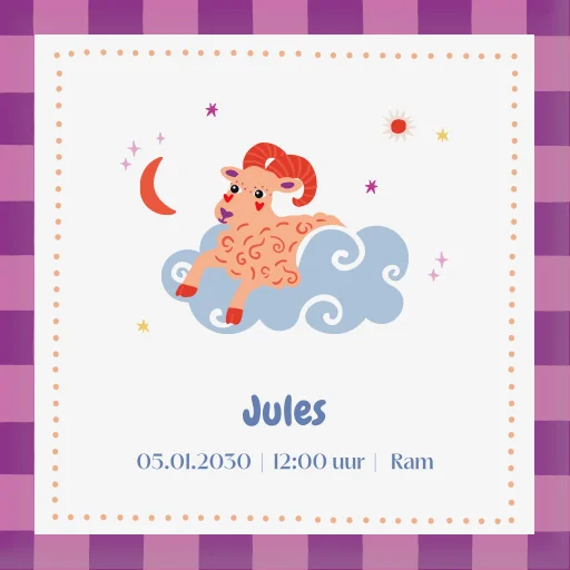 Versier de babykamer met dit kleurrijke geboortetegeltje met het sterrenbeeld ram! Bewerk het ontwerp gemakkelijk in de editor.