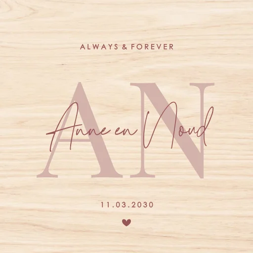 Een stijlvolle houten tegel met jullie initialen. Het is een prachtig natuur product en een uniek huwelijkscadeau. Personaliseer het ontwerp eenvoudig in onze online editor.
