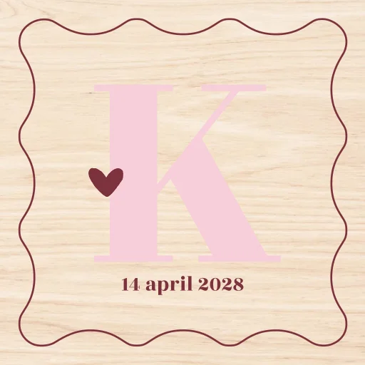 Een mooie houten tegel met initiaal, golvend kader en hartje. Het is een prachtig natuur product en geeft de illustratie een natuurlijk effect. Personaliseer het ontwerp eenvoudig in onze online editor.