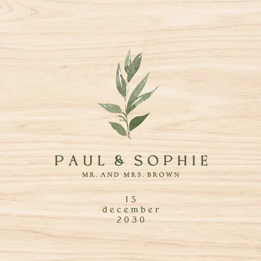 Een stijlvolle houten tegel met jullie namen en olijftakje. Het is een prachtig natuur product en een uniek huwelijkscadeau. Personaliseer het ontwerp eenvoudig in onze online editor.