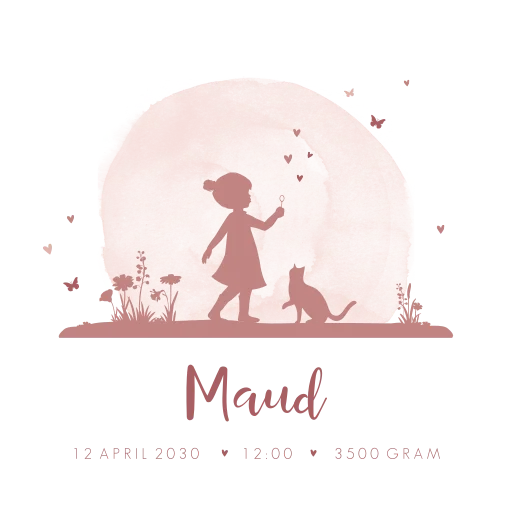 Hoe lief is dit geboortetegeltje met oudroze design! Dit tegeltje heeft schattige silhouetjes van een meisje en een kat met roze watercolour op de achtergrond. Tip: dit tegeltje is ook ideaal om te geven als kraamcadeautje! Pas het ontwerp naar wens aan in de online editor.