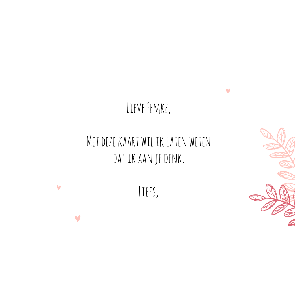 Een stijlvol kaartje om iemand beterschap mee te wensen. De achtergrond heeft een donkerblauwe kleur en langs de randen staan roze botanische elementen. In het midden is een lieve tekst geschreven in een sierlijk lettertype.