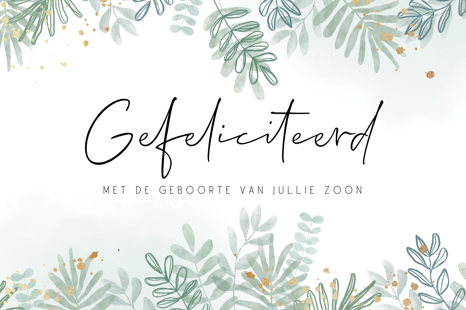 Wenskaart geboorte zoon met jungle bladeren en gouden spetters