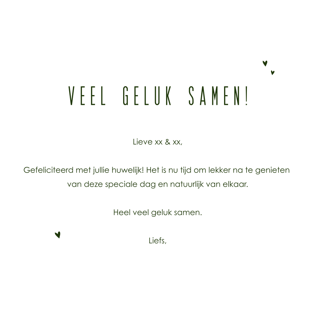 Felicitatiekaart trouwen donkergroen met hartjes en tekst in goudfolie