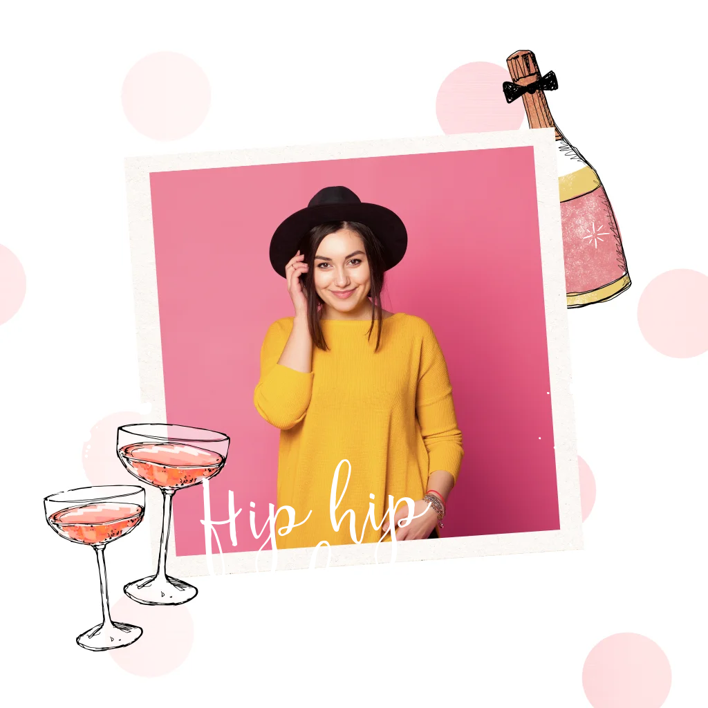 Een feestelijk felicitatiekaartje voor een vrouw met op de achtergrond een paar roze stippen. In het midden is plaats voor een persoonlijke foto. Het goudfolie maakt het helemaal af.
