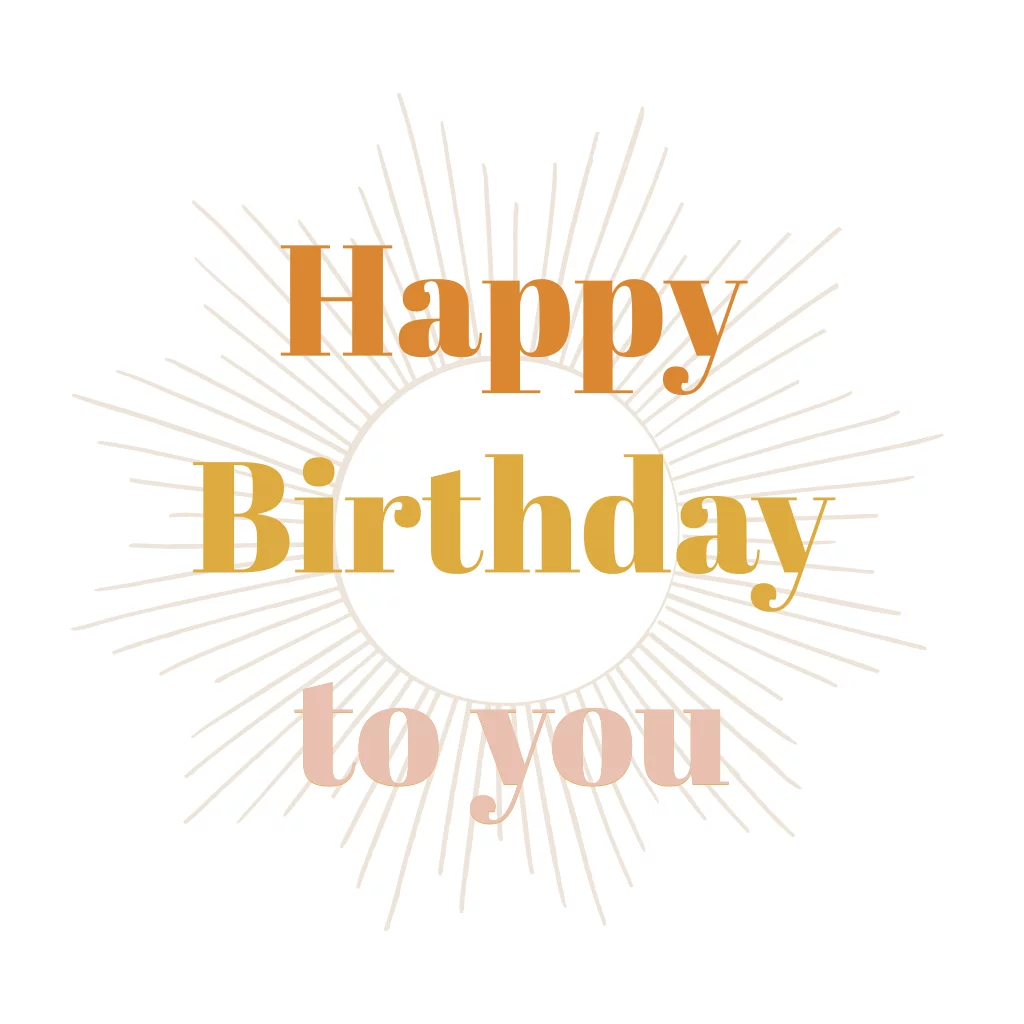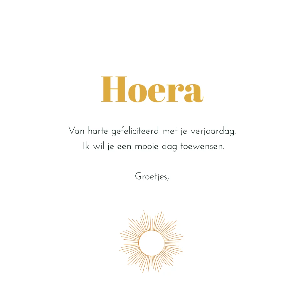 Wens de jarige jet een fijne dag door deze vrolijke kaart te sturen. Op dit ontwerp is een trendy zon te zien met daarvoor een felicitatie in vrolijke kleuren.