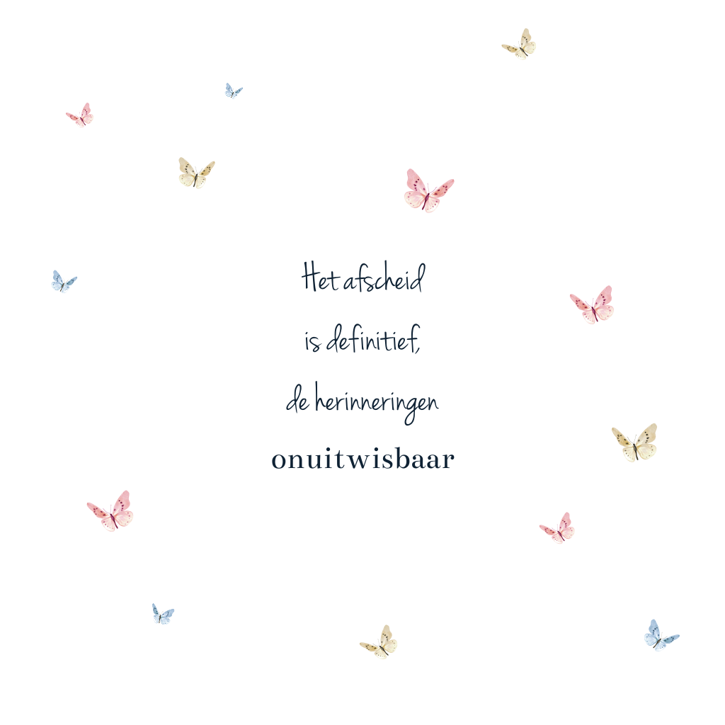 Een lieve en mooie condoleancekaart met een witte achtergrond en vlinders in verschillende kleuren. Het roséfolie maakt het een luxe geheel.