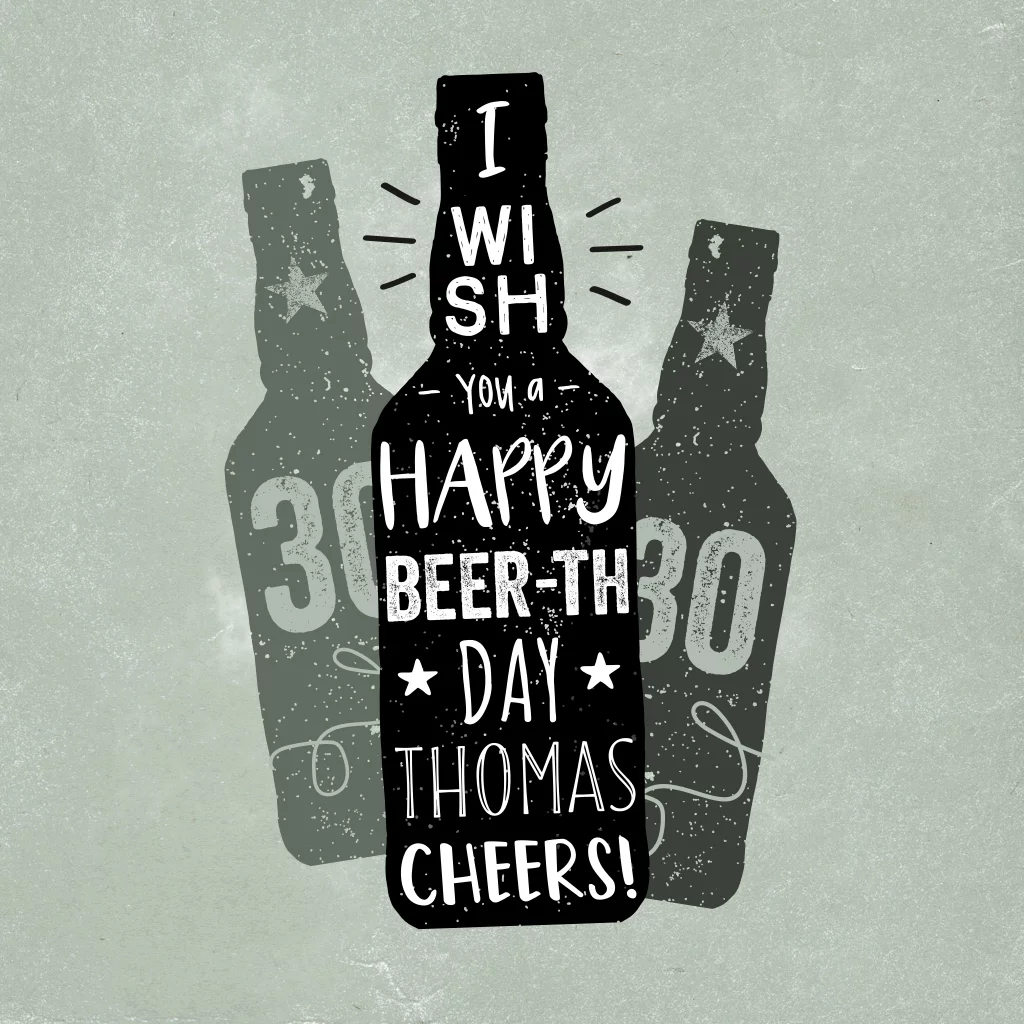 Proost! Wens de jarig job een fijne verjaardag toe met deze stoere kaart met flesjes bier. Pas de leeftijd en de naam van de jarige gemakkelijk zelf aan in de editor.