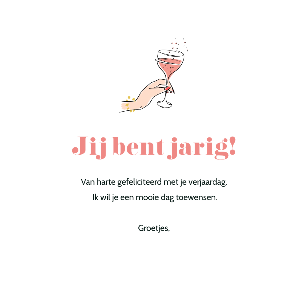 Wens de jarige een fijne verjaardag met deze hippe kaart. Er is een illustratie te zien van twee champagneglazen met roze champagne. Ontzettend feestelijk!