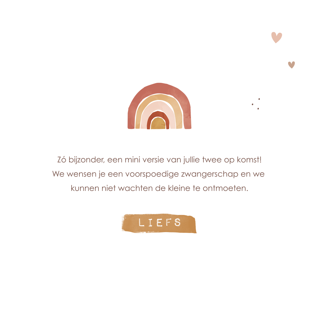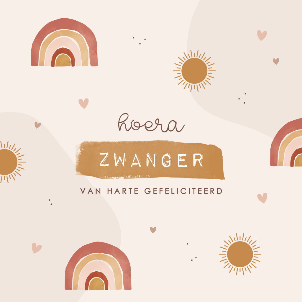 Hoera! Zwanger! Stuur deze vrolijke wenskaart met regenboogjes, zonnetjes en hartjes om de zwangere te feliciteren met dit bijzondere nieuws.