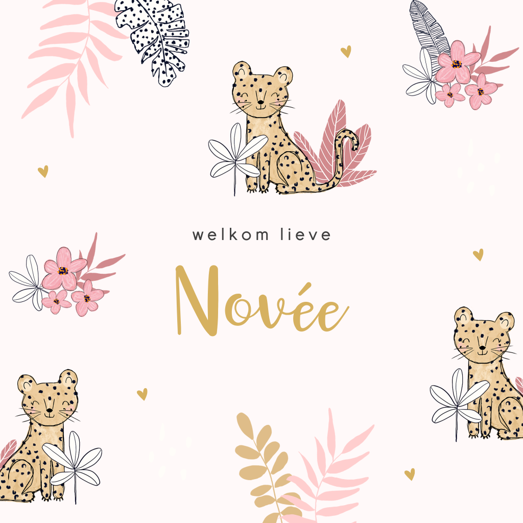 Welkom lief meisje! Kaart met lieve panters, takjes, bloemetjes en hartjes. Personaliseer deze wenskaart om de papa en mama te feliciteren met hun kleine meisje.